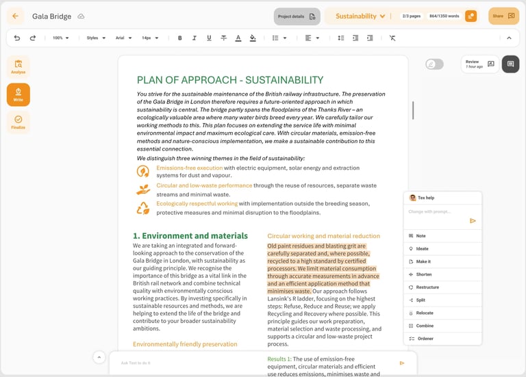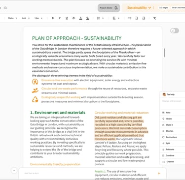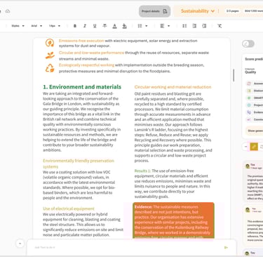 All available actions are executed by AI based on our trained text-model for proposal writing. TenderTools helps you refine your texts to score high and create very well-readable proposals, without taking much time.