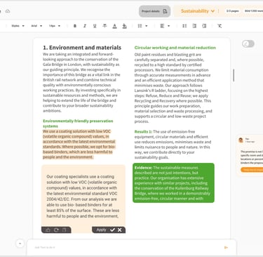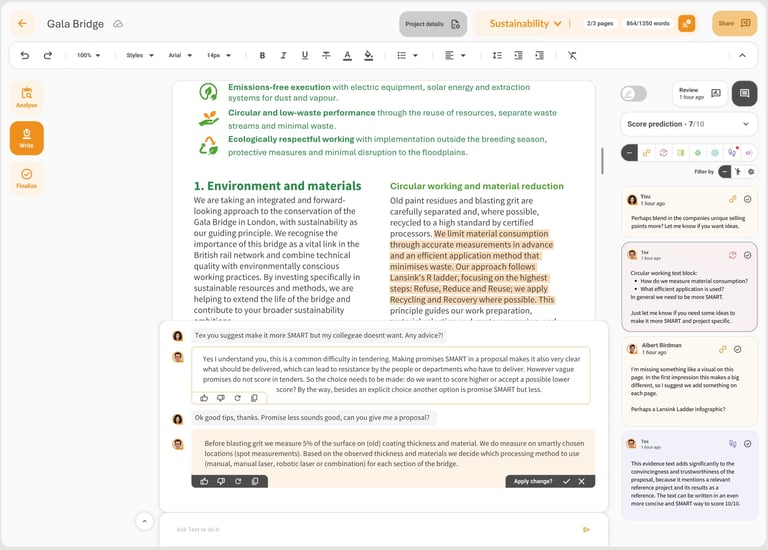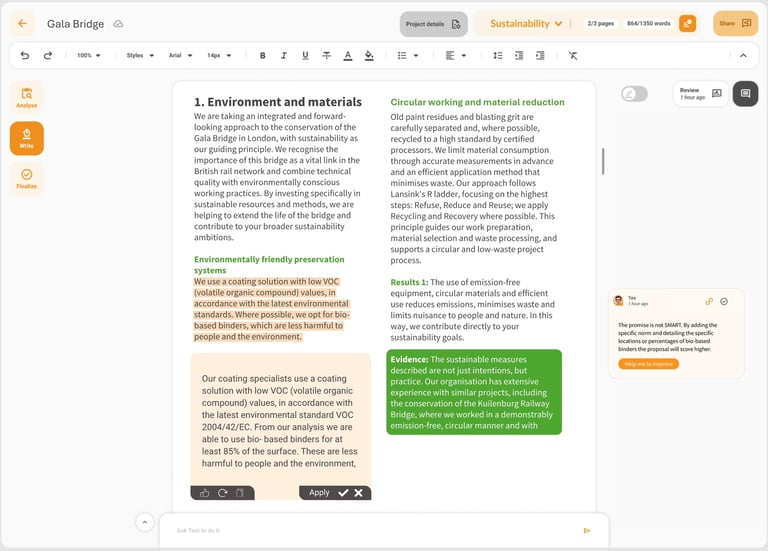 Tenderspecialists require 100% control over changes in their proposal text. Therefore our software, unlike other tender AI software, first shows you the new proposed text next to the current text.