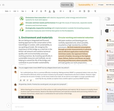 The AI sparring partner is well aware of the context of the tender which you work within, and has all the knowledge on tenders, bids, RFP's and RFQ's you may need.