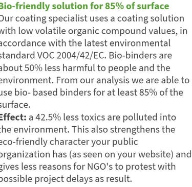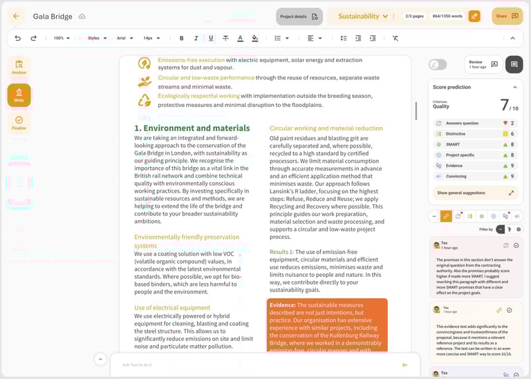 With TenderTools you have a senior tenderexpert available to predict the score of your proposal text. It shows you what is good and what to improve in order to get that 100% score.