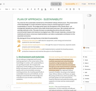 All available actions are executed by AI based on our trained text-model for proposal writing. TenderTools helps you refine your texts to score high and create very well-readable proposals, without taking much time.